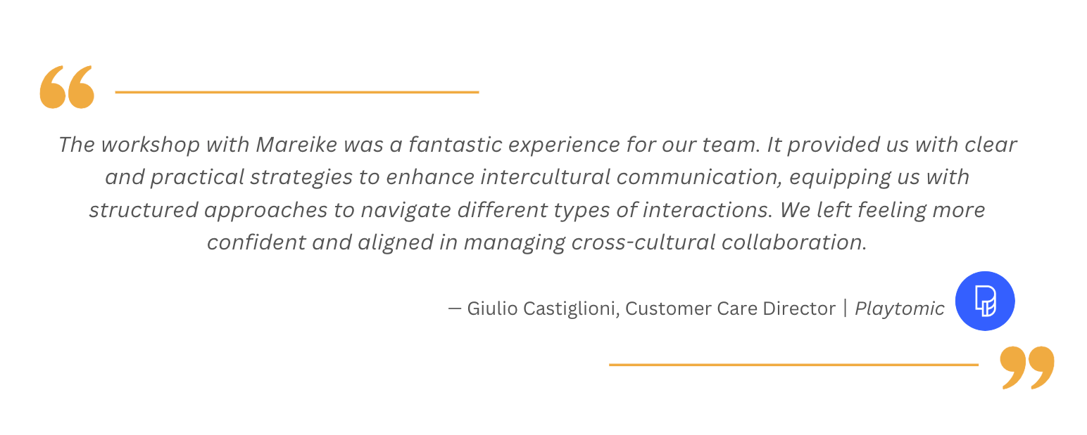 For companies that want focused work on a specific topic without committing to a longer engagement. Workshops are built around the same areas covered above (leadership development, leadership principles, culture and values, remote work and teams) plus (intercultural) communication and feedback. They run online or in person, vary in length depending on team-size and depth needed, and are shaped around your team's actual context.